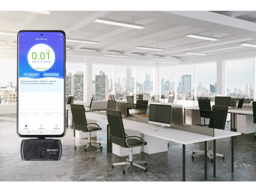 Formaldehyd je látka, která je přítomna v přírodě v malém množství, avšak ve vyšších koncentracích je považována za vysoce nebezpečnou pro zdraví. Přesto je HCHO nasazen v dřevěných výrobcích, plastech, lacích a barvách. Měřič koncentrace formaldehydu FAS-100 zjistí koncentraci plynné látky, představuje aktuální úroveň kvality vzduchu jako barevný ukazatel a v případě potřeby spustí poplach. Lze tak kdykoli zajistit, aby vnitřní vzdušný tlak nezpůsoboval žádné obavy. Díky USB rozhraní typu C lze data zobrazit na tabletu nebo smartphonu. Díky malým rozměrům je lehkým společníkem pro mobilní měření ve školách, dílnách nebo kancelářích.