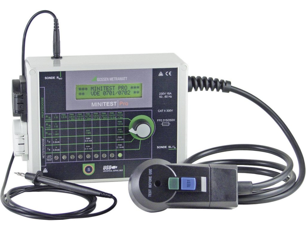 Přístroj ke zkoušení elektrické bezpečnosti a elektrických provozních prostředků dle DIN VDE 0701-1: 2000 a DIN VDE 0702 s bodovým maticovým displejem a signalizací překročení mezních hodnot barevnou LED, rozsáhlá jistící nastavení, USB rozhraní k protokolaci dat.Vlastnosti: