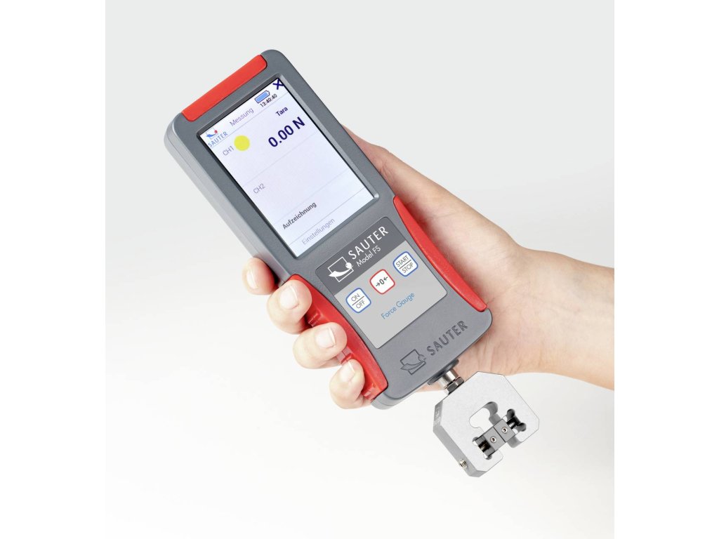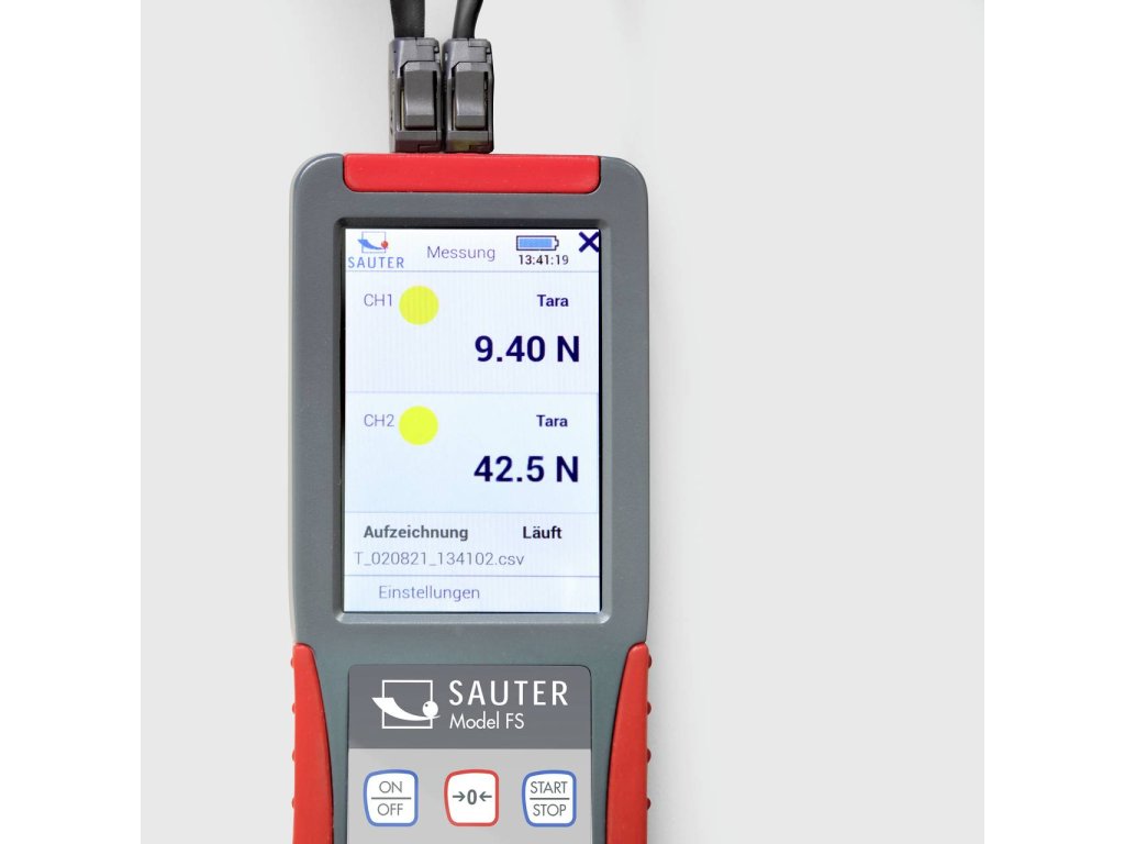 Použití s integrovaným měřicím článkemTento měřič síly Premium Sauter FS má integrovaný měřicí článek pro použití ve vlaku a při tisku. Díky multifunkčnímu displeji lze snadno sledovat všechny naměřené hodnoty v reálném čase, a to bez ohledu na to, zda je mobilní pro rychlé testování nebo stacionární. Přes integrované rozhraní lze data odeslat do počítače nebo notebooku k dalšímu zpracování; použití s externími měřicími články