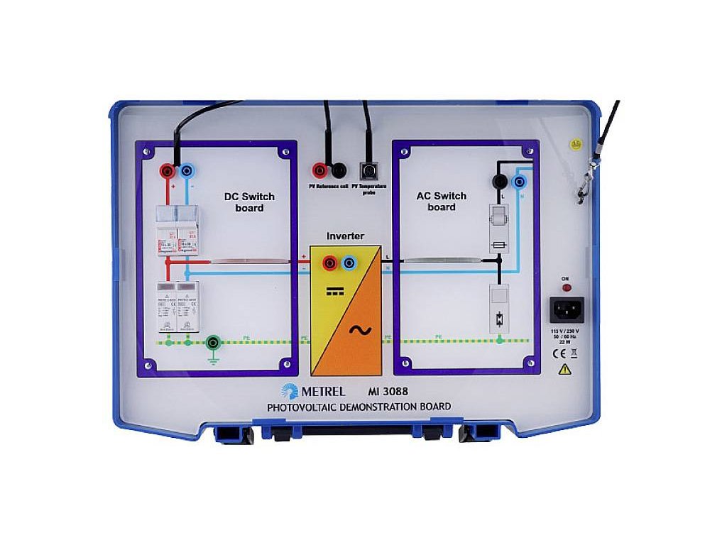 Demonstrační deska mi 3088 simuluje typické fotovoltaické systémy s PV modulem a DC/AC měničem. Typické zařízení se skládá z PV-String, DC-spínacích boxů, DC/AC měničů a jednofázové přípojky do elektrické sítě. Používá se především distribuční personál k demonstraci metod a postupů měření na straně DC a částečně i na straně AC fotovoltaického systému.Tento text byl přeložen strojově.