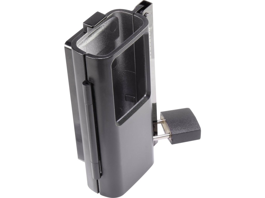 Držák se na stěnu připevní pouze dvěma šrouby. V případě potřeby stačí sundat zámek, odklopit závoru směrem nahoru, otevřít dvířka držáku a uložit do něj datalogger. Pak můžete datalogger bezpečně uzamknout díky zámku, který je součástí dodávky. Bez velkých nákladů tak předejdete možné krádeži.