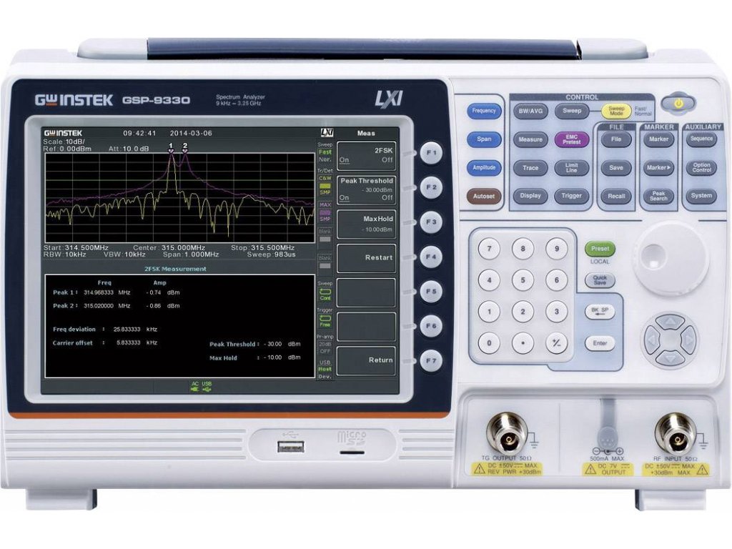 GSP-9330, spektrální analyzátor s vysokou testovací rychlostí a 3,25 GHz, poskytuje nejrychlejší sweep rychlost 204 μs. Uživatel může pomocí vysokorychlostní doby rozmítání snadno manipulovat a analyzovat modulační signály. Klíčem k zacházení s modulovanými signály je rychlá doba rozmítání a funkce demodulace signálu. Navíc k funkci analogové AM/FM demodulace a analýzy nabízí GSP-9330 i funkce digitální signální ASK/FSK a 2FSK demodulace a analýzy. GSP-9330 má zabudované řešení předtestování EMC pro usnadnění EMV testů. GSP-9330 umožňuje snadné a jednoduché procesy předtestování EMV a díky tomu výrazně zkracuje časový rámec pro uvedení produktu na trh.Specifikace: