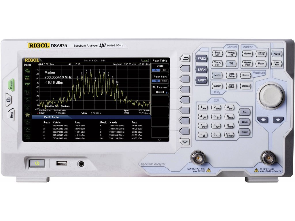 Spektrální analyzátor DSA875-TG je vhodný jak pro volnočasové aktivity, tak pro profesionální použití. Díky rozmanitosti softwarových nástrojů a možných doplňků je ideální pro EMI (EMC) testování tzv. „Pre-Compliance“ v rámci přípravy na přijetí specifikací EMV. S frekvenčním rozsahem lze měřit vrchní vlny 3. řádu pásma ISM 2,4 GHz.Specifikace: