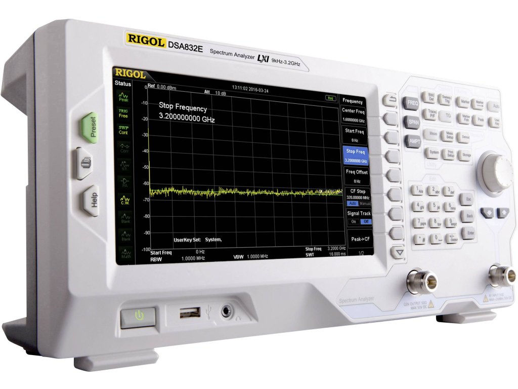 Spektrální analyzátor DSA832E-TG je vhodný jak pro poloprofesionální, tak i pro profesionální použití. Díky rozmanitosti softwarových nástrojů a možných doplňků je ideální pro EMI (EMC) testování tzv. „Pre-Compliance“ v rámci přípravy na přijetí specifikací EMV.Specifikace: