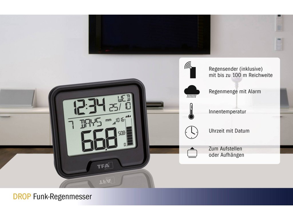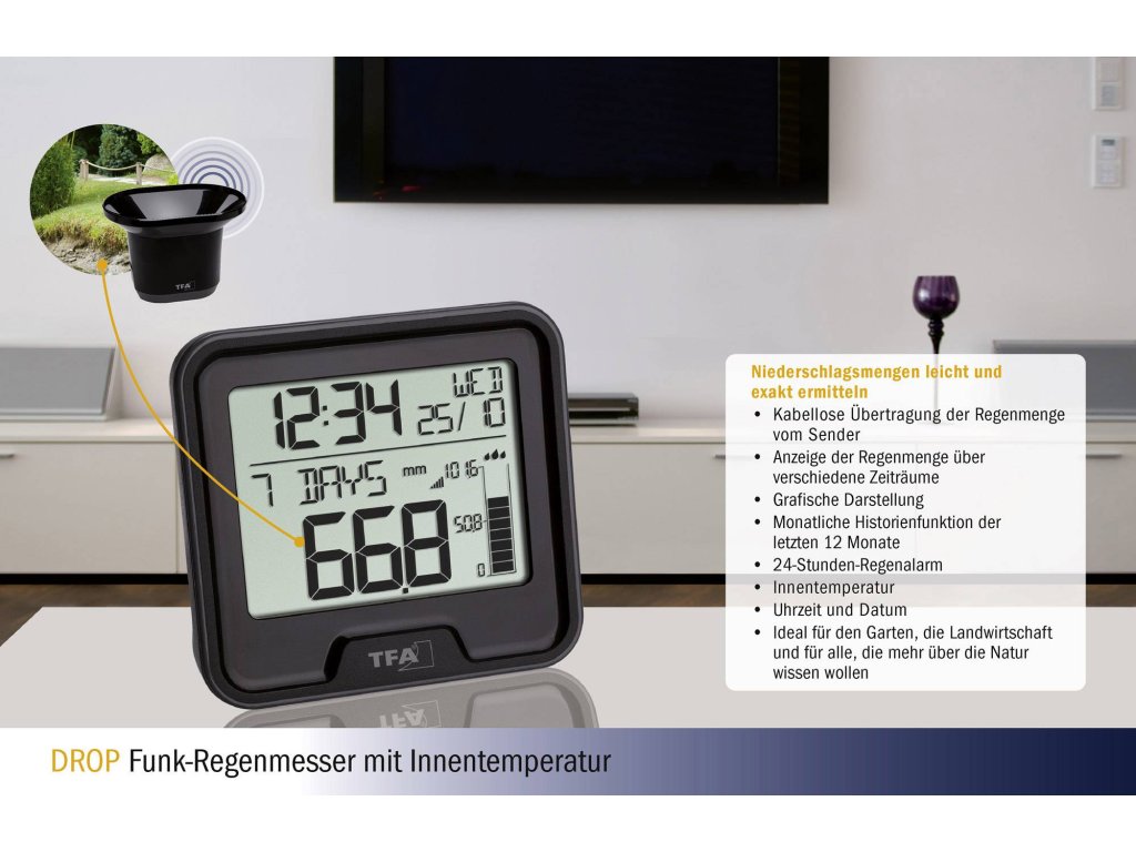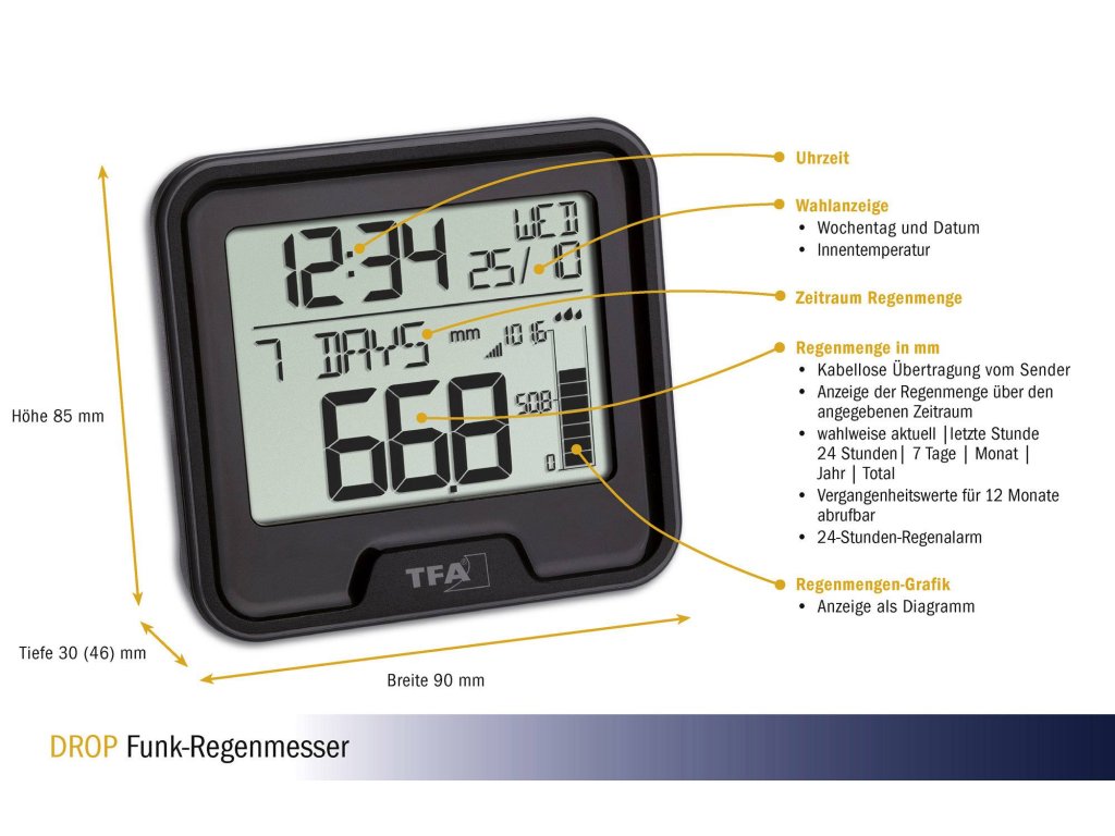 Bezdrátový srážkoměr DROP budete přes tři hodnoty současně: informuje o množství srážek, vnitřní teplotě a čase. Bezdrátově přenáší naměřené hodnoty na základní stanice množství stanic v obývacím prostoru, které potřebujete mít buď postavení nebo na zeď. Měřicí nádoba se vodorovně venku, postavit do cca 60 až 90 cm výšky, a zachytí déšť. Upozorňujeme, že vysílač na jednom místě, který díky stromy nebo dergleichen chráněn a na dešťový volně ze všech stran případech může odposlouchávat ho.DROP přináší mnoho dalších užitečných funkcí: díky historie můžete množství srážek s měsíční vodivosti Vorjahres. Množství srážek vám graficky zobrazuje. Přitom můžete sledovat různé prostory, jako například srážek za posledních 24 hodin, 7 dní až po celkové množství srážek od uvedení do provozu.