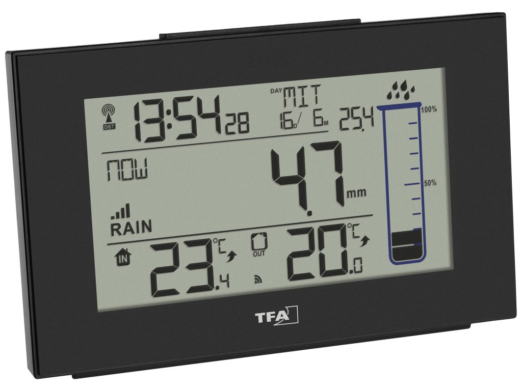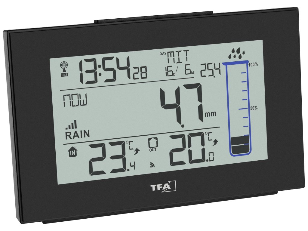Bezdrátový přenos venkovní teploty a množství srážek (max. 60 m)Zobrazení a grafické zobrazení aktuálního množství srážek, poslední hodiny, posledních 24 hodin, celého dne, posledních 7 dní aktuálního měsíce, aktuálního roku a celkemFunkce historie za posledních 12 měsícůUpozornění na déšť po 24 hodináchVnější a vnitřní teplota se zobrazením tendence a funkcí zobrazení max. A min. HodnotRádiově řízené hodiny se dnem v týdnu (7 jazyků) a datemBudík se 2 časy buzeníNastavitelný rytmus buzení (každý den, pracovní den, víkend)Funkce opakovaného buzení s nastavitelnou dobou trváníPodsvícení