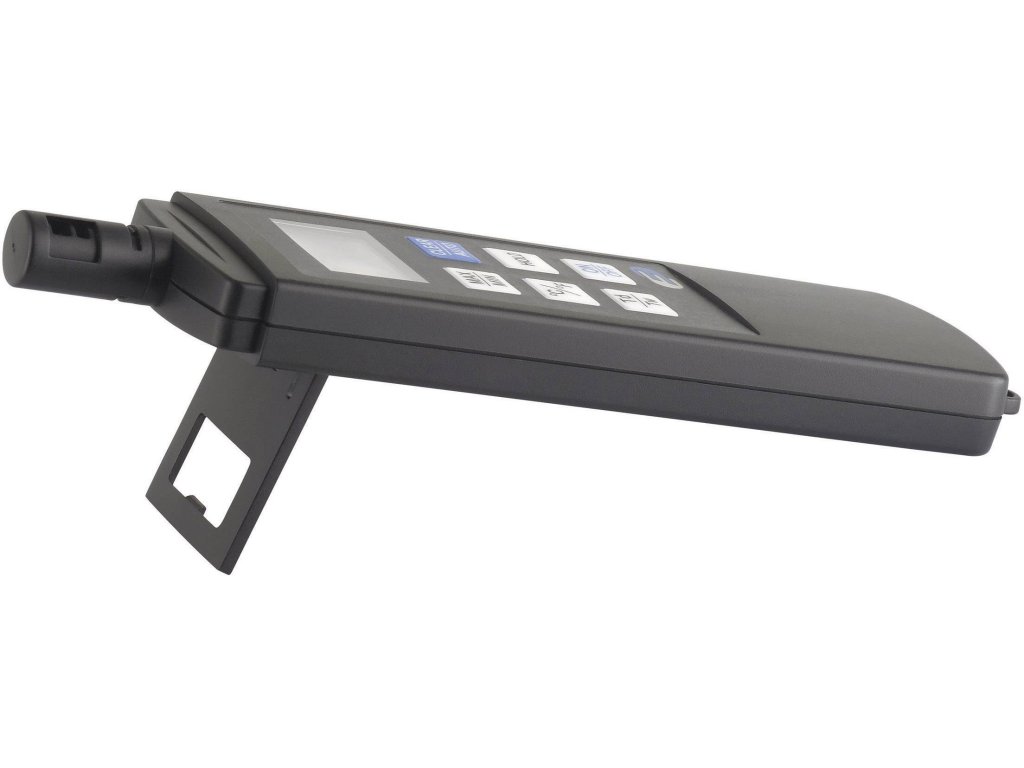 Teplota (přesnost měření ±0,5°C) a vlhkosti (přesnost ±3 % od 20…90 %, jinak ±4 %) · Funkce Hold a měření max. a min. hodnot · Údaje o rosném bodu · teplota vlhkého teploměru.