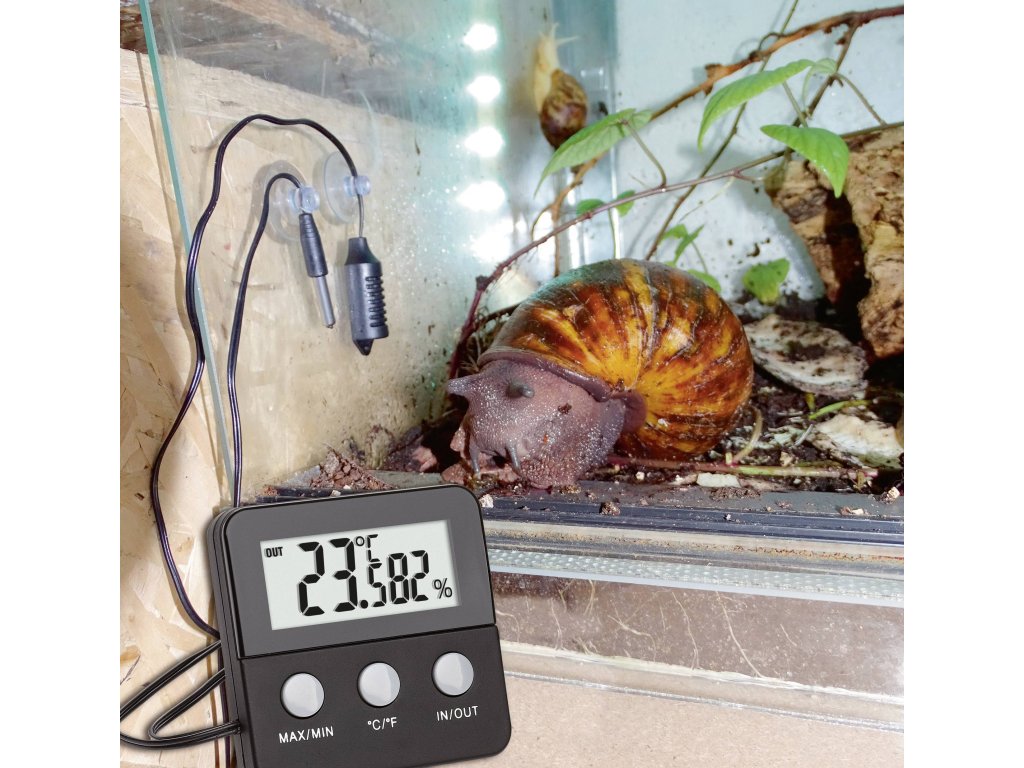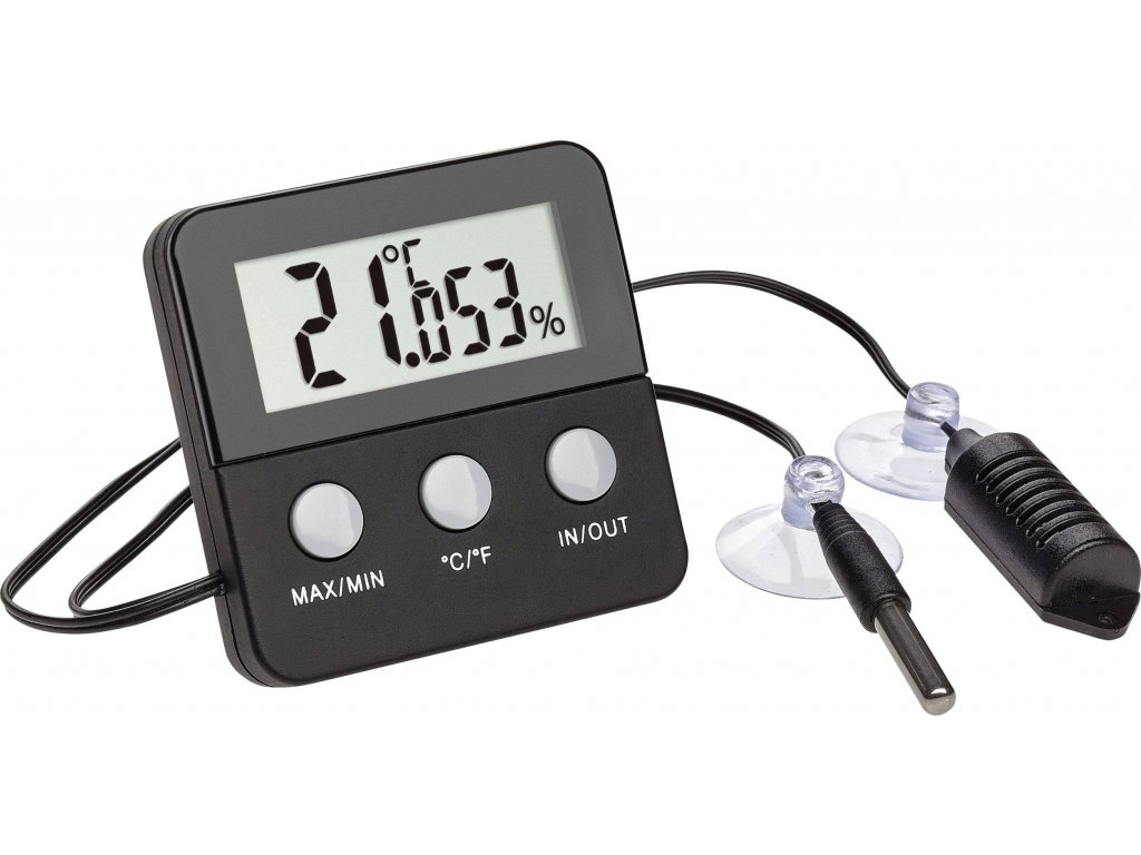 Digitální teploměr a vlhkoměr měří přes dva samostatné kabelové čidlo teploty a vlhkosti vzduchu. S přísavkami lze čidla snadno na podložky na Terrariums nasazení - a k čištění stejně snadno opět snadno odmontovat.
