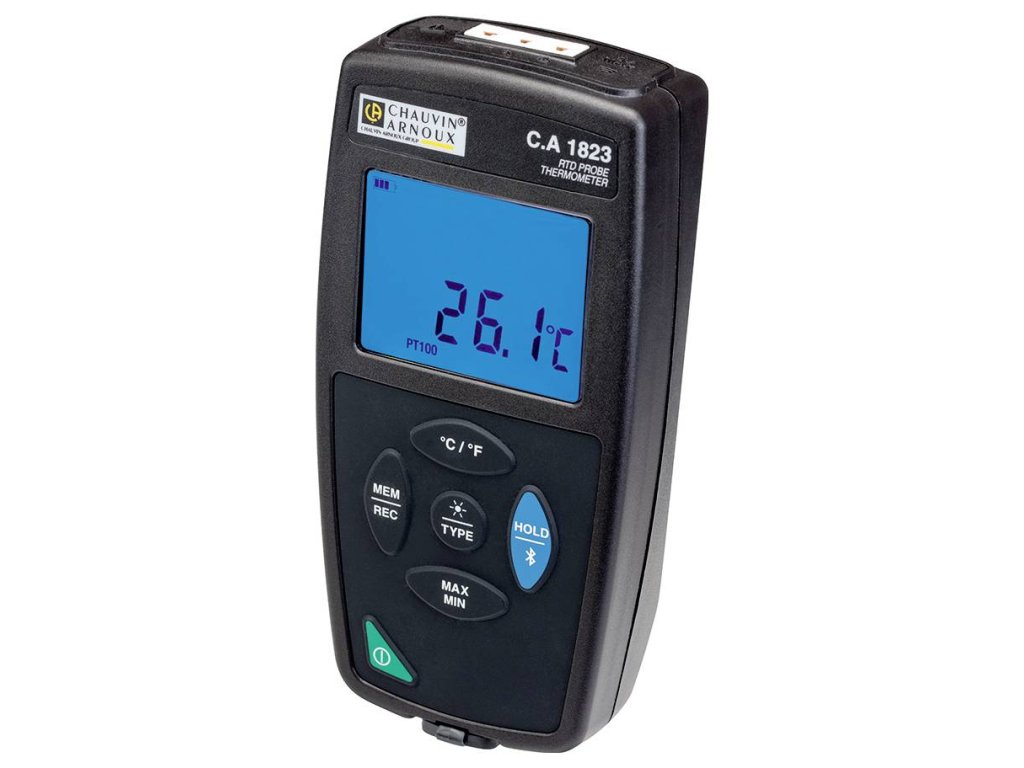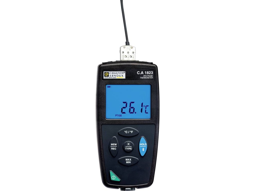 C.A 1823 je kompaktní kontaktní teploměr s magnetickým držákem, který garantuje přesné, mnohostranné a spolehlivé měření při stacionárním a mobilním použití. Přístroj má velký podsvícený ukazatel se všemi funkcemi požadovanými na místě, jako je ukazatel hodnot min, max, funkce Hold a také může ukládat naměřené hodnoty ručně nebo podle naprogramování. Zařízení může být připojeno k síti přes USB nebo Bluetooth®, takže alarmy a začátek zaznamenávání hodnot lze naprogramovat pomocí softwaru Data Logger Transfer.Specifikace: