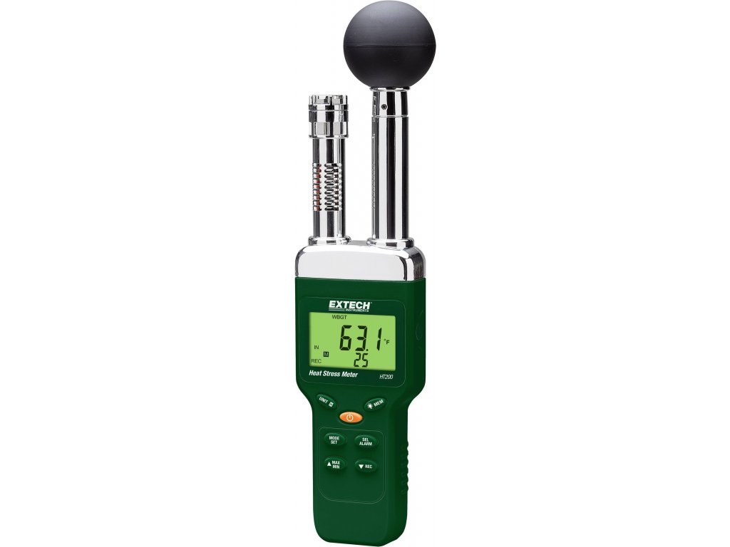 Přístroj na měření tepelného stresu měří teploty WGBT (wet bulb globe temperature), TG (black globe temperature), vlhkost vzduchu, teplotu vzduchu, teplotu vlhkého teploměru a rosný bod. Kombinace vlhkosti, teploty, proudění vzduchu a přímého slunečního záření přesně určí tepelné zatížení organismu. Přístroj používá kapacitní senzor k přesnému měření teploty Wet Bulb Globe (WBGT), teploty Black-Globe-Temperature (TG), relativní vlhkosti (% rH), teploty vzduchu (TA), teploty vlhkého teploměru (WT) a rosného bodu (DEW). Teplota Black-Globe (TG) sleduje účinky přímého slunečního záření na volnou plochu. Výrobek je vybaven funkcemi pro interiér a exteriér, které spočítají hodnotu včetně nebo bez přímého slunečního záření. Dále je zde akustická a vizuální horní a spodní poplachová funkce pro měření WBGT, min. / max., uložení dat, automatická funkce vypnutí s možností deaktivace a zobrazení stavu baterií.Tento text byl přeložen strojově.