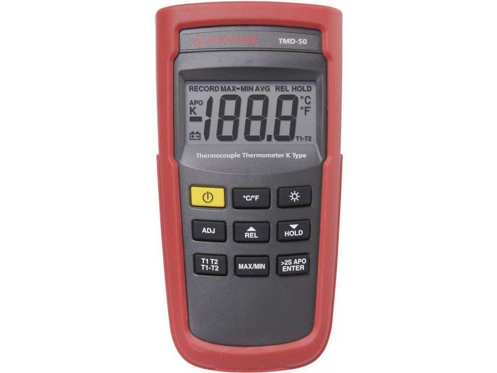 Nárazuvzdorný digitální teploměr se 2 senzorovými vstupy. Připojení se provádí pomocí termočlánku.Specifikace: