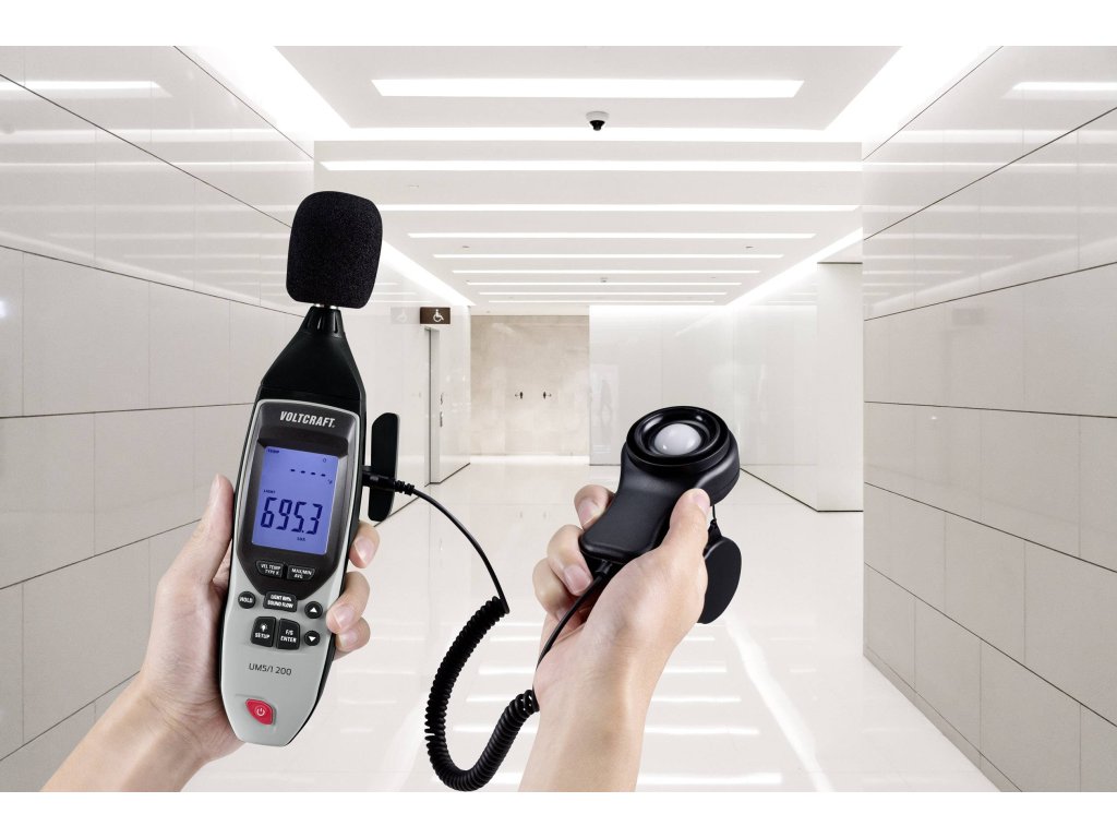 VOLTCRAFT UM5 / 1 200 je univerzální měřič parametrů prostředí. Spojuje měření až 5 senzorů v jednom zařízení (hlukoměr, luxmetr, vlhkoměr, teploměr, stanovení rosného bodu a CFM / CMM teploměr a anemometr). Multifunkční měřič parametrů prostředí se hodí pro profesionální i soukromé použití.HlukoměrHlukoměr lze použít k měření hluku v továrnách, školách, kancelářích a v bytech.LuxmetrLuxmetr slouží k měření intenzity světla. Je plně kosinově korigovaný pro dopad světla pod úhlem.Vlhkoměr/teploměrVlhkoměr používá polovodičový senzor a teploměr. Používá se termočlánek typu K.CFM / CMM teploměr a anemometrTento teploměr a anemometr se hodí pro řadu aplikací, včetně údržby zařízení, analýz životního prostředí, laboratorních testů a systémových hodnocení topných, větracích a klimatizačních systémů.USB rozhraníNaměřená data lze přes USB rozhraní přenést do počítače. Data se zobrazují a ukládají pomocí dodaného PC softwaru.Specifikace: