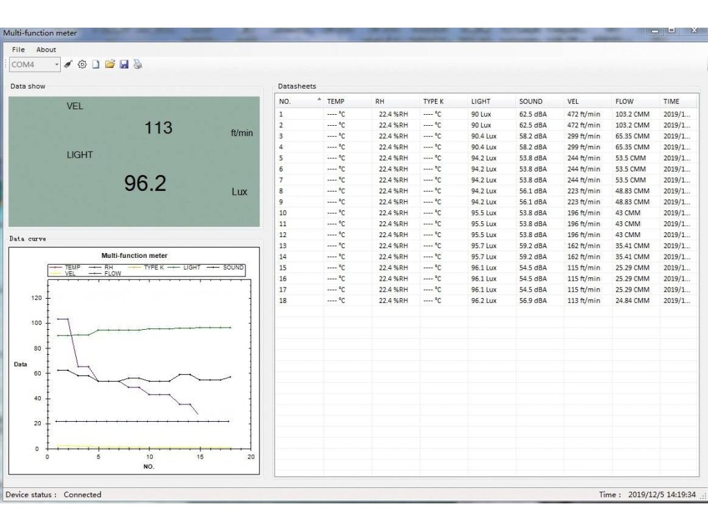 5 funkcí v jednom zařízení: Hlukoměr, luxmetr, vlhkoměr a teploměr, a také CFM / CMM anemometrSoučasně lze použít 5 senzorůZobrazení hlučnosti, intenzity světla, teploty, vlhkosti vzduchu, rychlosti větru a směru větru současněVelký LCD displej s podsvícenímUSB rozhraní