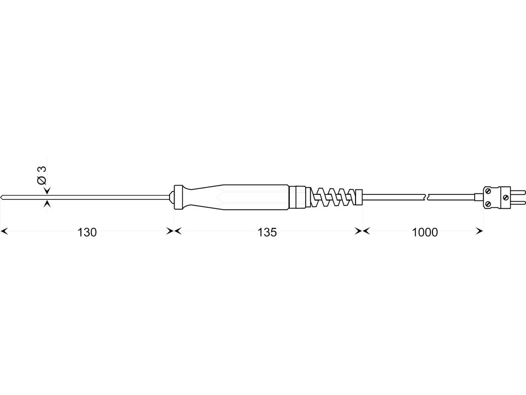 Pevný měřící hrot V4A, jmenovitá délka 130 mm, Ø 3 mm · 1 m dlouhý silikonový kabel · Zástrčka typu K.