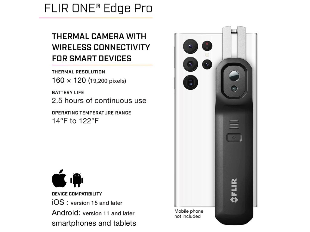 Termokamera FLIR One Edge pro je inovativní a odolná termografická kamera, kterou lze bezdrátově propojit s vaším chytrým zařízením, takže můžete kontrolovat i nedosažitelné cíle - nebo ji připevňovat k telefonu či tabletu, abyste je mohli ovládat jednou rukou. Díky kombinaci VividIR™ a FLIR MSX® můžete z každé pozice a z každého úhlu zachytit ostré snímky a to přirozenou rukojetí.S modelem FLIR Ignite™ můžete jednoduše přenést snímky a videa z FLIR One Edge pro do cloudového úložiště, kde můžete data zpracovávat, organizovat, ukládat a předávat dále. Díky kompatibilitě se smartphony a tablety se systémy iOS, Android a FLIR One Edge pro lze používat bez omezení, nezávisle na provozovateli sítě, operačním systému, velikosti nebo budoucích vylepšení Smart Devices. Dálkové inspekce v nebezpečných oblastech až do vzdálenosti 30 m. Obsluha jednou rukou díky připojení FLIR One Edge pro do vašeho chytrého zařízení. Pohodlné skenování mimo dosah díky tomu, že FLIR One Edge pro držíte v jedné ruce a v druhé ruce Smart zařízení pro jasný výhled na obrazovku.