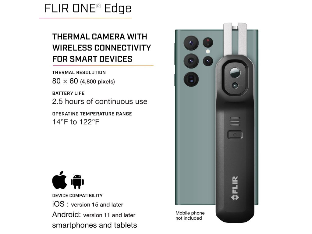 Termokamera FLIR One Edge představuje inovativní a odolnou termokameru, se kterou můžete bez problémů kontrolovat těžko přístupná místa z každé pozice a úhlu. Kameru můžete bezdrátově propojit se zařízením Smart a kontrolovat tak cíle mimo zorné pole - nebo ji připevněte k telefonu nebo tabletu pro ovládání jednou rukou. S technologií FLIR MSX® můžete vytvářet detailní termosnímky, abyste mohli jednoznačně rozpoznat, kde je problém.Aplikace FLIR One nabízí návod k řešení problémů a kontrole oprav v mnoha oblastech využití pro domácí kutily i profesionální, včetně elektrických a mechanických kontrol v domácnosti, v automobilovém průmyslu a v průmyslu................“ vhodná pro profesionální použití.....“ vhodná pro měření např. nákladů na energii a energii..“; „bezpečnost a App pro využití v domácnostech Díky bezdrátovému připojení lze použít stejnou kameru se zařízeními se systémem Android i iOS, takže můžete s členy své týmu snadno sdílet nářadí. Všechny vaše termosnímky a videa se ukládají přímo do vašeho mobilního zařízení a jsou tak snadno přístupné pro další použití. Díky připojení ke FLIR Ignite™ můžete data ihned nahrávat do cloudového úložiště, kde můžete vytvářet zprávy a organizovat a sdílet data s cílem zlepšit efektivitu práce.