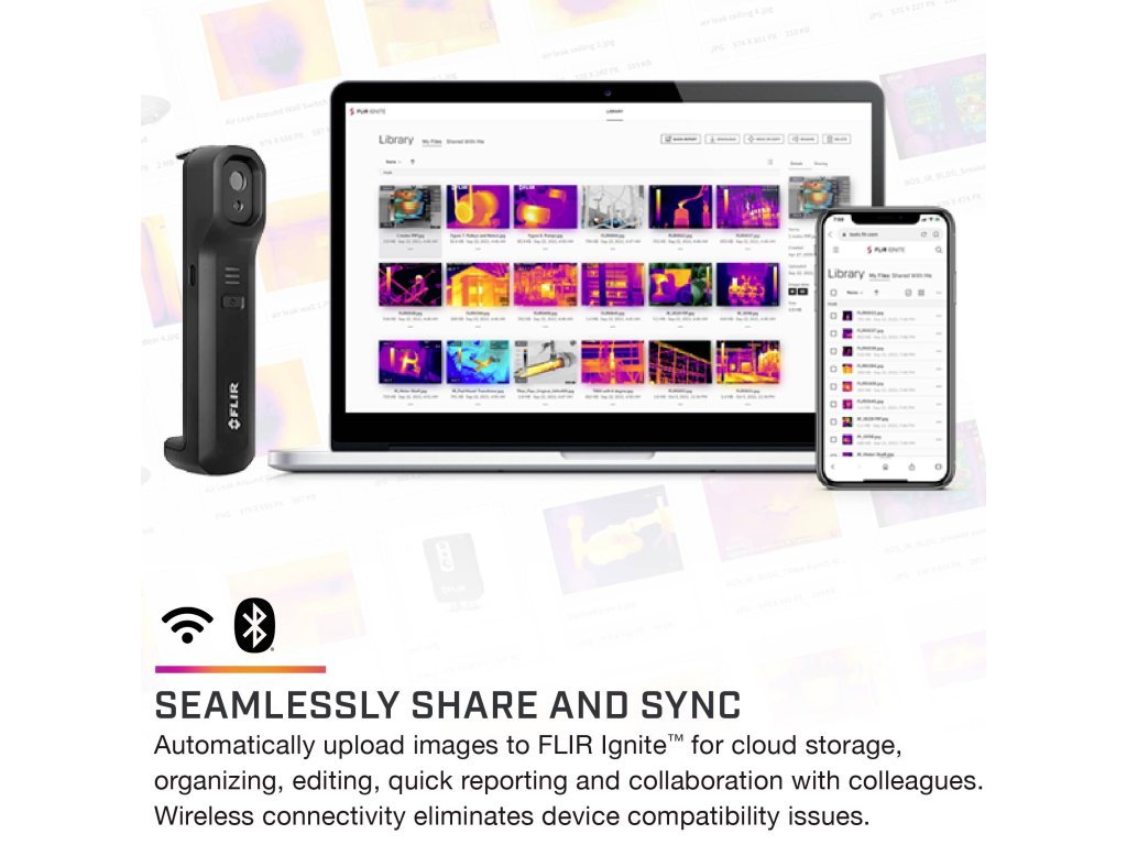 FLIR MSX® · FLIR Ignite™ · Wireless 80 x 60 pixelů · Měření teploty až do 120 °C. Odolné provedení · Životnost baterie 1,5 h. 8.7 Hz · IP54