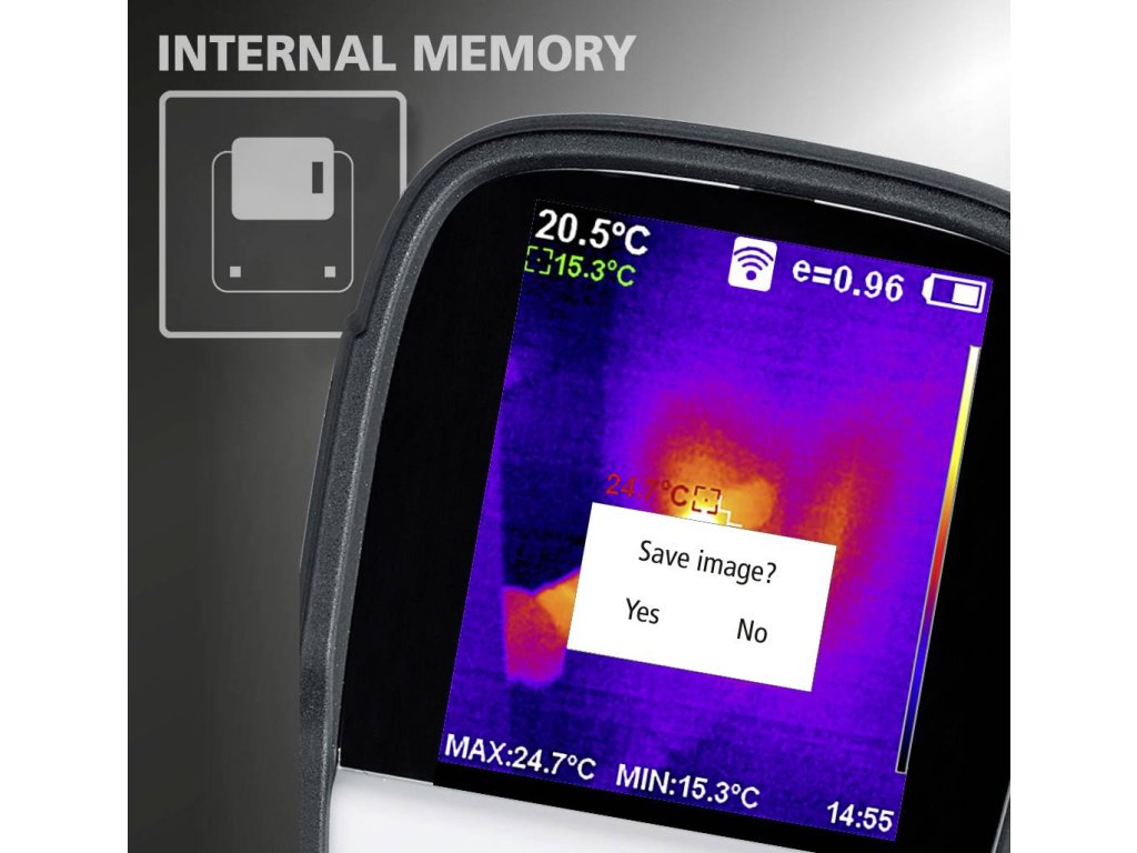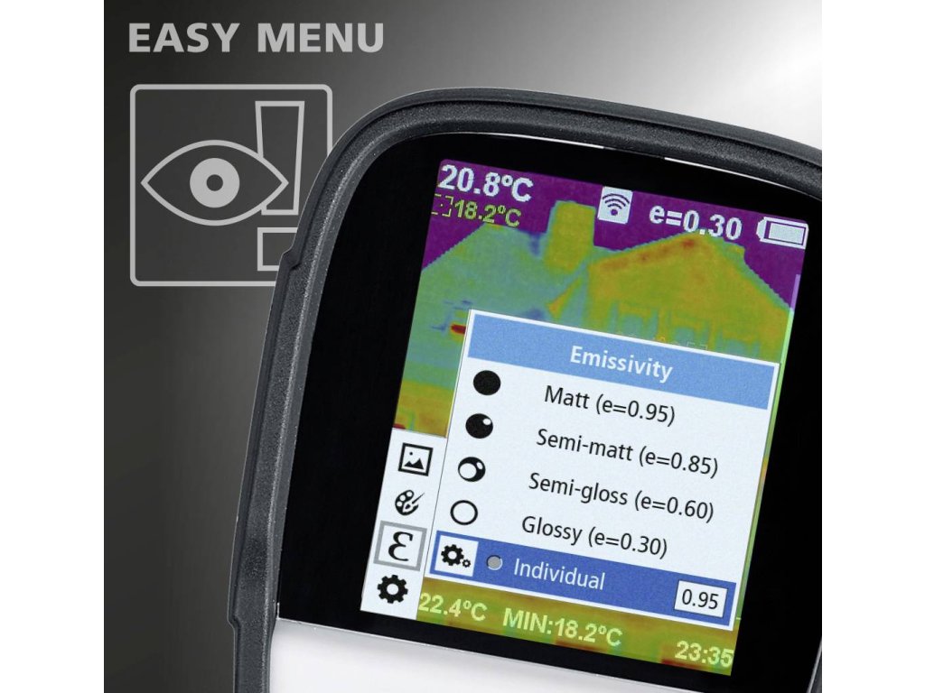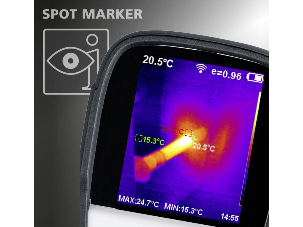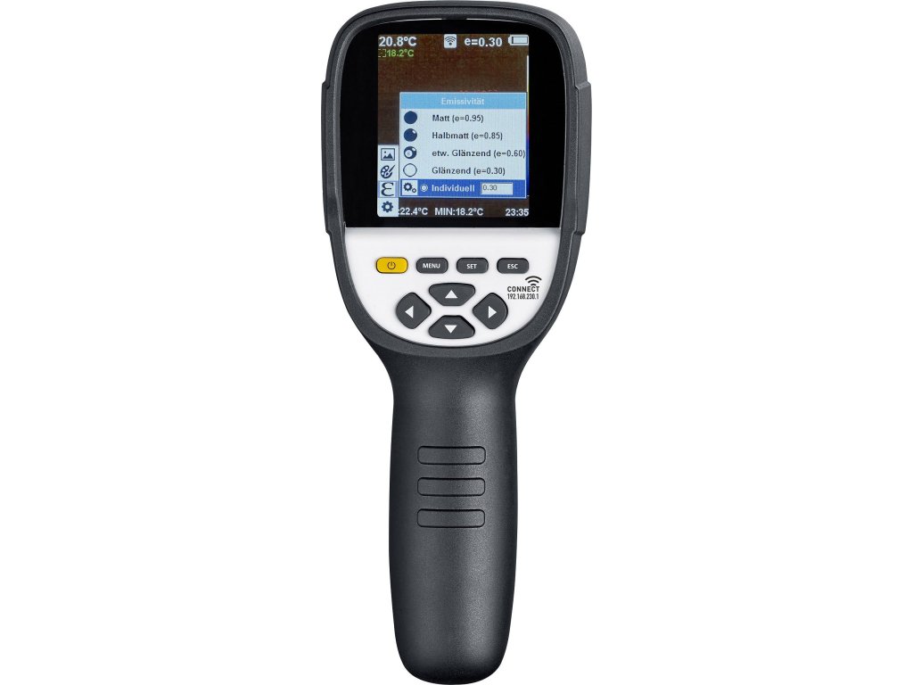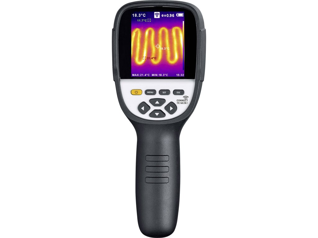 Kompaktní termokamera pro použití v oblasti stavebnictví, elektrotechniky a strojírenství 3,2" barevný displej s vysokým rozlišením pomáhá spolehlivě vyhodnotit a analyzovat teplotní podmínky, infračervený senzor s rozlišením 220 x 160 pixelů umožňuje rychlé a snadné měření pro vyhodnocení teplotních profilů. Kamera má velký rozsah měření -20 °C…350 °C, rozsah emisních hodnot je nastavitelný od 0,01 až do 1,0. Kromě toho jsou k dispozici přednastavené povrchy. Analýzu je do možné přepnout do různých režimů obrazu: infračervený obraz na celou obrazovku, digitální obraz, smíšený obraz: prolínání infračerveného a digitálního obrazu.. Kamera má centrální měřicí bod pro tepelnou analýzu a doplňkové značení teplých/studených bodů. Standardní výběr barev: spektrum, železo, studená, bílá, černá. Přenos dat a ovládání přes WiFi, umožňuje zobrazení živého infračerveného obrazu.Vlastnosti: