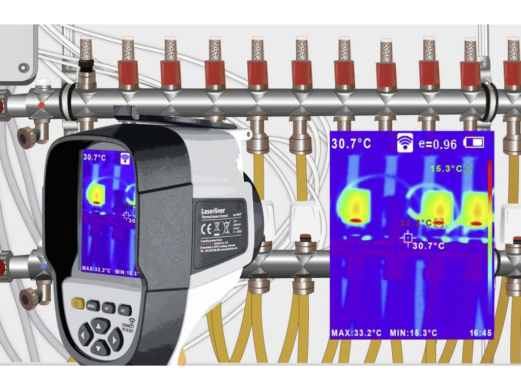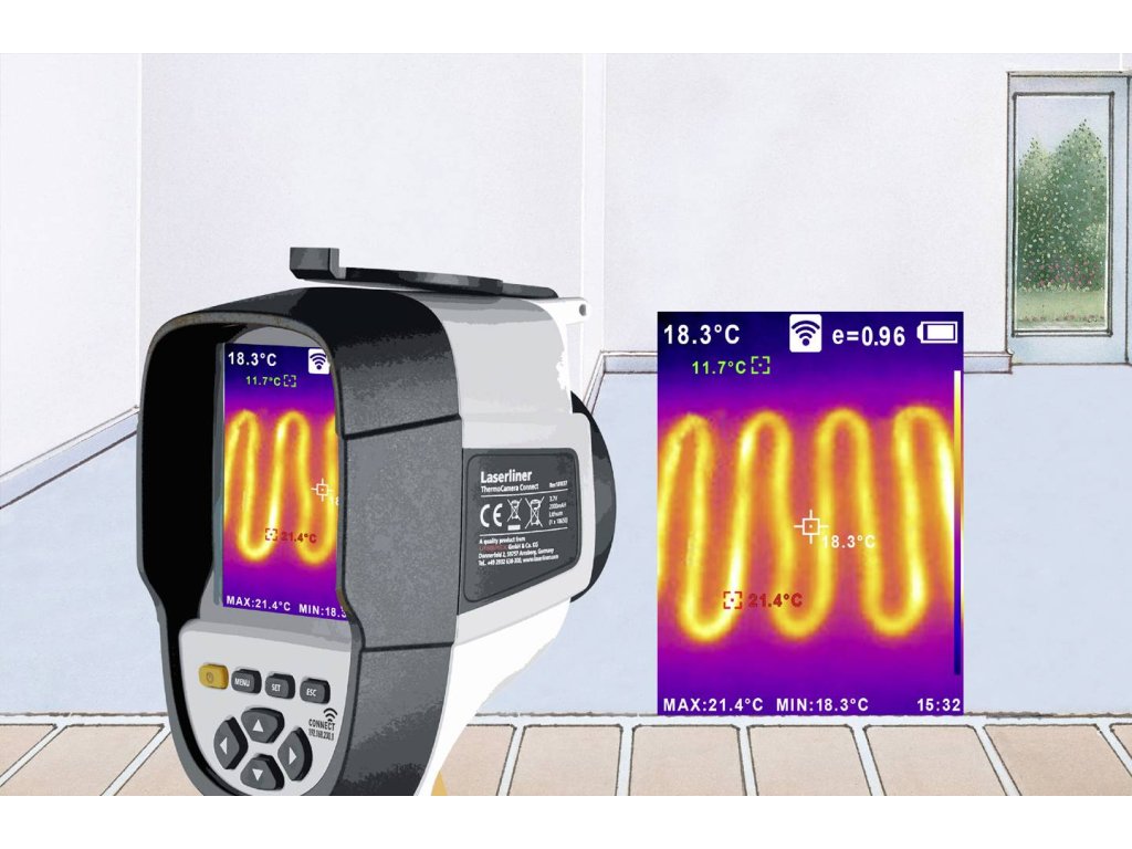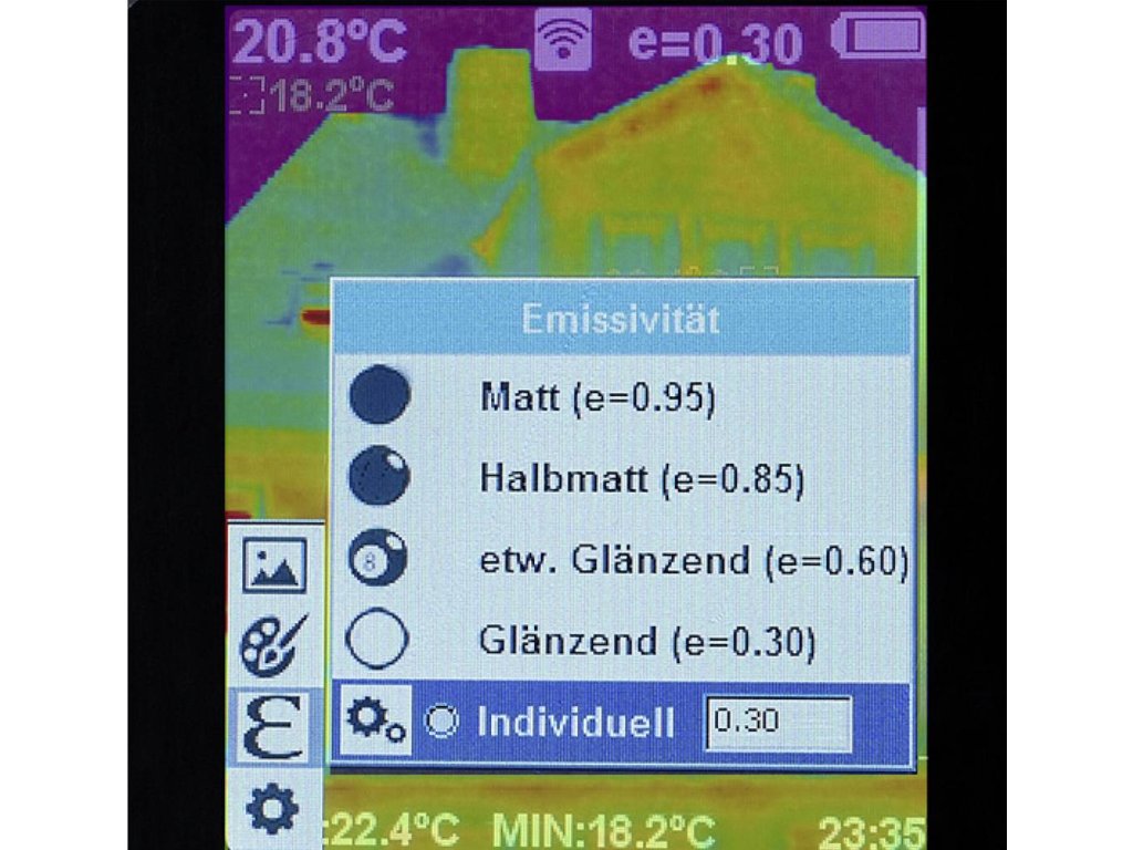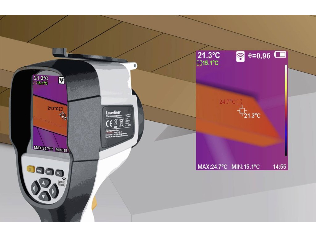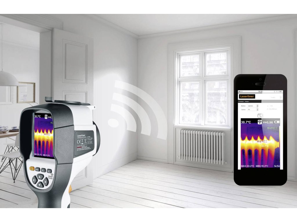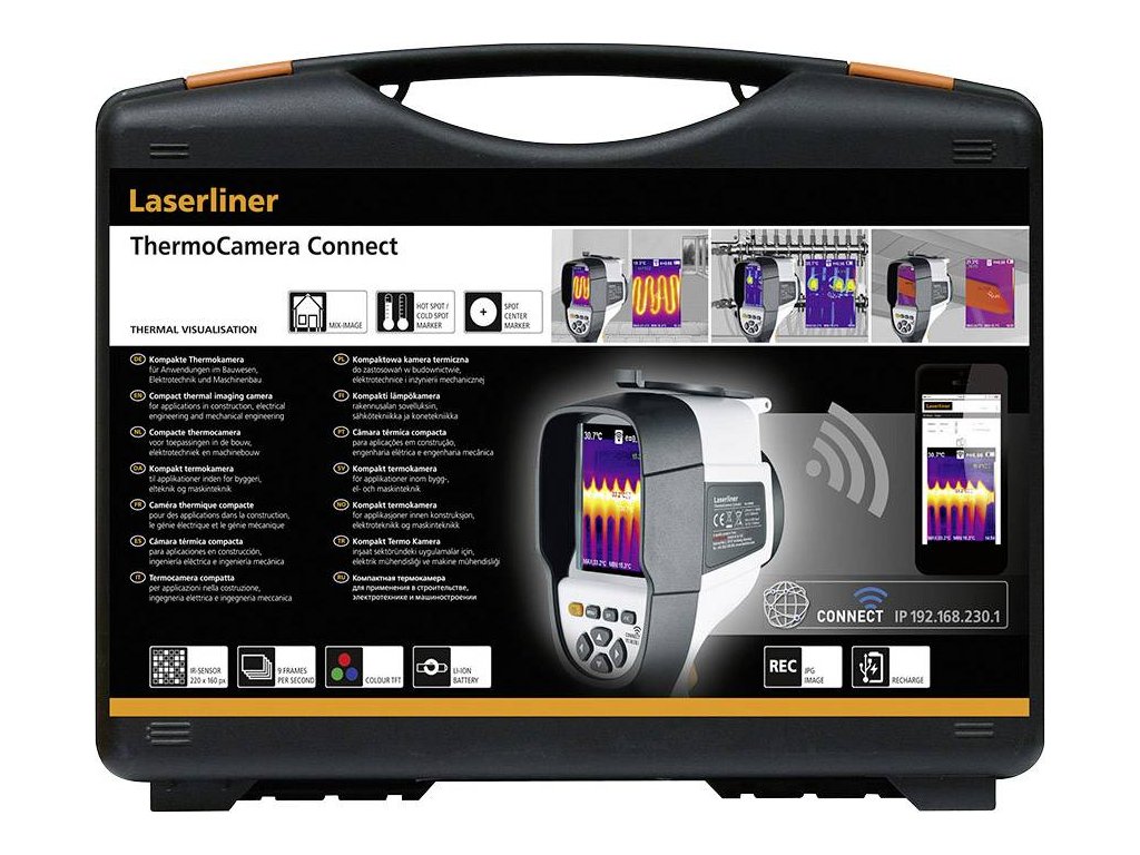 Kompaktní termokamera pro použití v oblasti stavebnictví, elektrotechniky a strojírenství 3,2" barevný displej s vysokým rozlišením pomáhá spolehlivě vyhodnotit a analyzovat teplotní podmínky, infračervený senzor s rozlišením 220 x 160 pixelů umožňuje rychlé a snadné měření pro vyhodnocení teplotních profilů. Kamera má velký rozsah měření -20 °C…350 °C, rozsah emisních hodnot je nastavitelný od 0,01 až do 1,0. Kromě toho jsou k dispozici přednastavené povrchy. Analýzu je do možné přepnout do různých režimů obrazu: infračervený obraz na celou obrazovku, digitální obraz, smíšený obraz: prolínání infračerveného a digitálního obrazu.. Kamera má centrální měřicí bod pro tepelnou analýzu a doplňkové značení teplých/studených bodů. Standardní výběr barev: spektrum, železo, studená, bílá, černá. Přenos dat a ovládání přes WiFi, umožňuje zobrazení živého infračerveného obrazu.Vlastnosti: