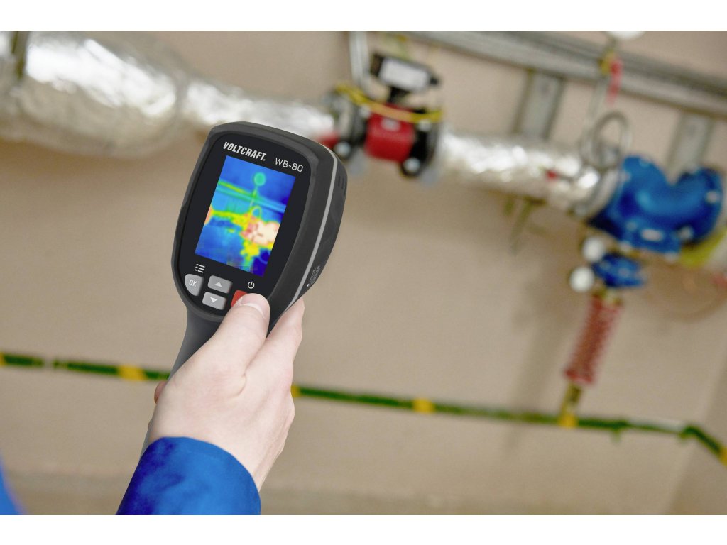 Bezdotykové měření teplotyAž už to budou pukliny na fasádě nebo trhliny v potrubí - možnosti použití termokamery Voltcraft WB-80 jsou rozmanité. S pevnou ohniskovou vzdáleností a termickou citlivostí 247 mK je vhodná také pro kontrolu solárních zařízení, strojů nebo topných zařízení v rozsahu měření teploty od -20 °C do +600 °C. Bolometr s rozlišením 32 x 32 pixelů slouží k měření celého spektra vlnových délek při obrazové frekvenci 9 Hz. Aby bylo možné určit správnou teplotu, lze emisivitu nastavit na měřený materiál a kromě toho je k dispozici teplotní kompenzace, aby se zabránilo ovlivňování teplotou okolí.