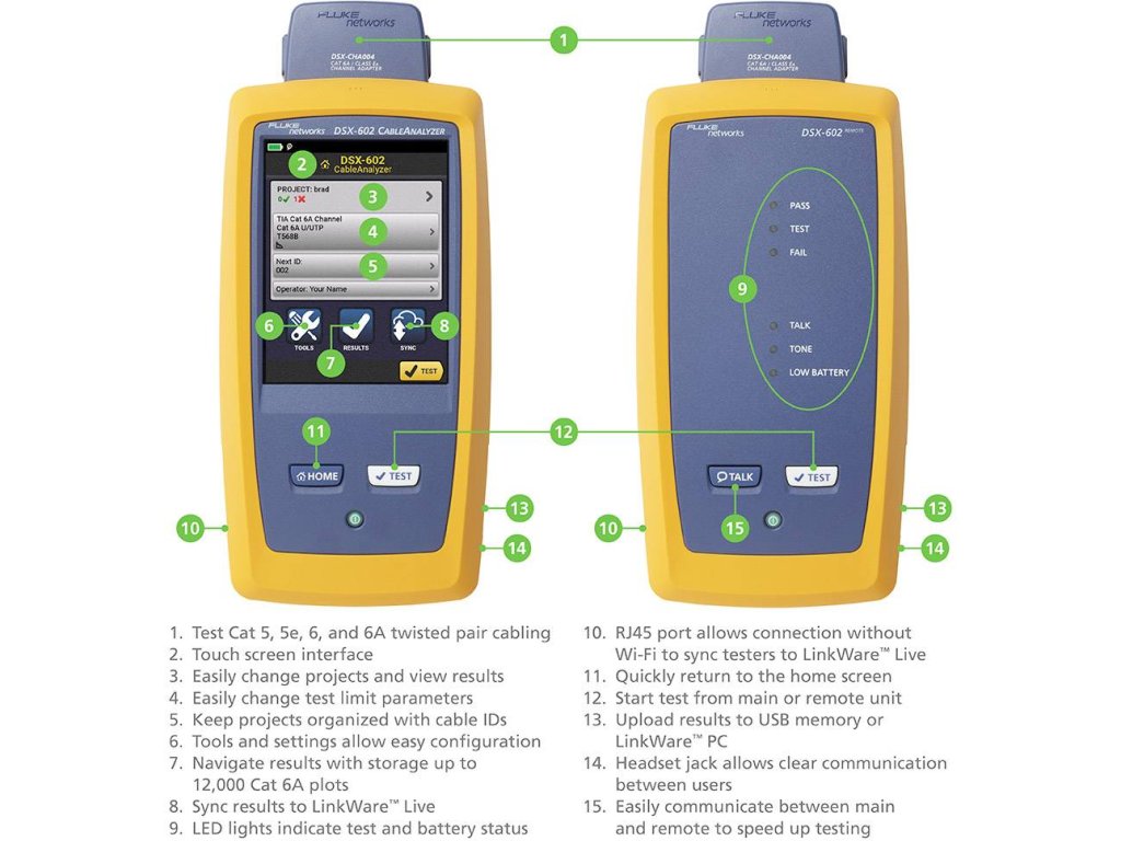 Na DSX-602 Cable Analyzer je základním certifikace nástroj pro měděné, Twisted Pair strukturované kabeláže Cat 3 / třída C až Cat 6A / Class EA. Vyznačuje se rychlost a spolehlivost, efektivní a produktivněji. Které gesta uživatelské rozhraní umožňuje váš technikům méně času s vysvětlení obrazovek i více čas s testování v klidu usnout. 500 MHz frekvenční rozsah certifikováno Cat 6A / Class EA kabeláže pro 10gigabitový Ethernet v pouze 10 sekund. Rozšířené diagnostických funkcí lokalizaci závady místo.Link zboží™ s pomocí cloudové modelů live servisní můžete Zertifizierungsauftrage kdykoli, kdekoli a s každým na každém zařízení.