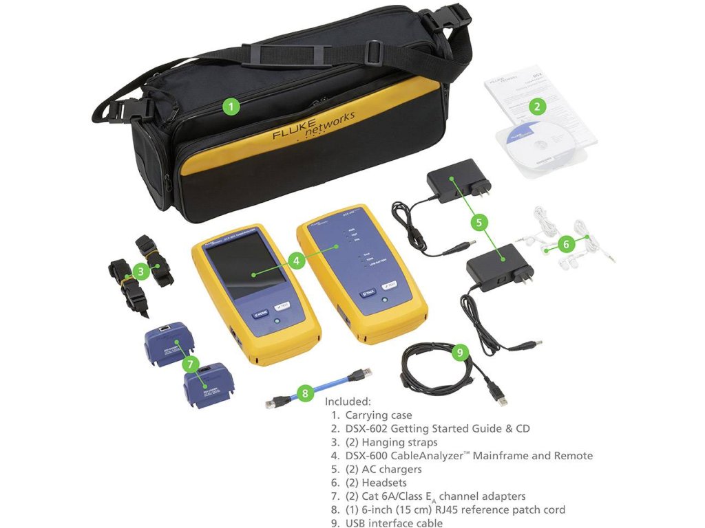 DSX-602 Cable analyzátor hlavní přístroji a Smart Remote · 2x Cat 6A / Class EA kanálový adaptér · 6" (15 cm) referenční patch kabel RJ45 · Brašna · USB kabel pro PC komunikace · 2x AC adaptér DSX-602 · První kroky k obsluze
