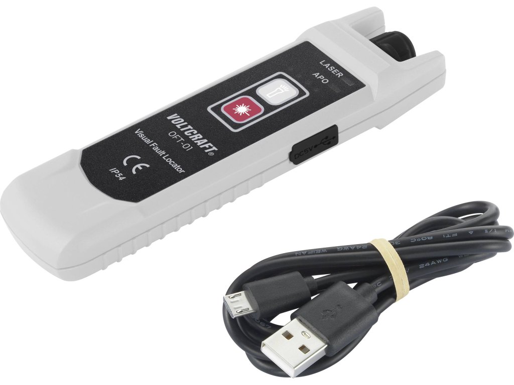 Nebezpečí rozpoznáno, nebezpečí zažehnánoPříruční a v zářivě červené barvě nabízená zkoušečka optických vláken Voltcraft s dobíjitelným Li-Ion akumulátorem a s automatickým vypínáním při nepoužívání umožňuje uživatelsky přívětivé vizuální vyhledávání poruch. Ve vzdálenosti až 3 km může být provedena zkouška optického vodiče, kterou měří laser s trvalým a s přerušovaným svitem (v režimu blikání). LED dioda signalizuje stav laseru ve třech stupních: Zapnuto, blikání, nebo vypnuto. A pokud baterie zeslábne, ukáže čtyřstupňový výstražný indikátor stavu baterie, kdy bude potřeba přístroj nabíjet přes USB kabel. Kromě toho je zadní strana zkoušečky optického vlákna vybavena svorkou, takže se dá kdykoli rychle připnout do brašny na hrudi nebo na kalhotách.Specifikace: