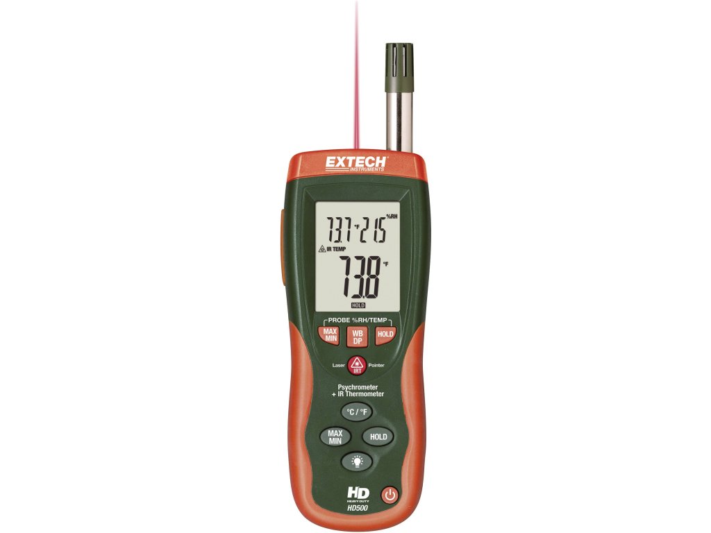 Vlhkoměr EXTECH HD500 s IR teploměrem je kombinací teploměru a vlhkoměru v jednom zařízení. Měření teploty provádí teploměr typu K pro kontaktní měření teploty. Kromě toho vestavěný IR teploměr umožňuje bezkontaktní měření teploty povrchu. Přístroj HD-500 má velký, podsvícený třísegmentový LCD displej a rozhraní USB.Specifikace: