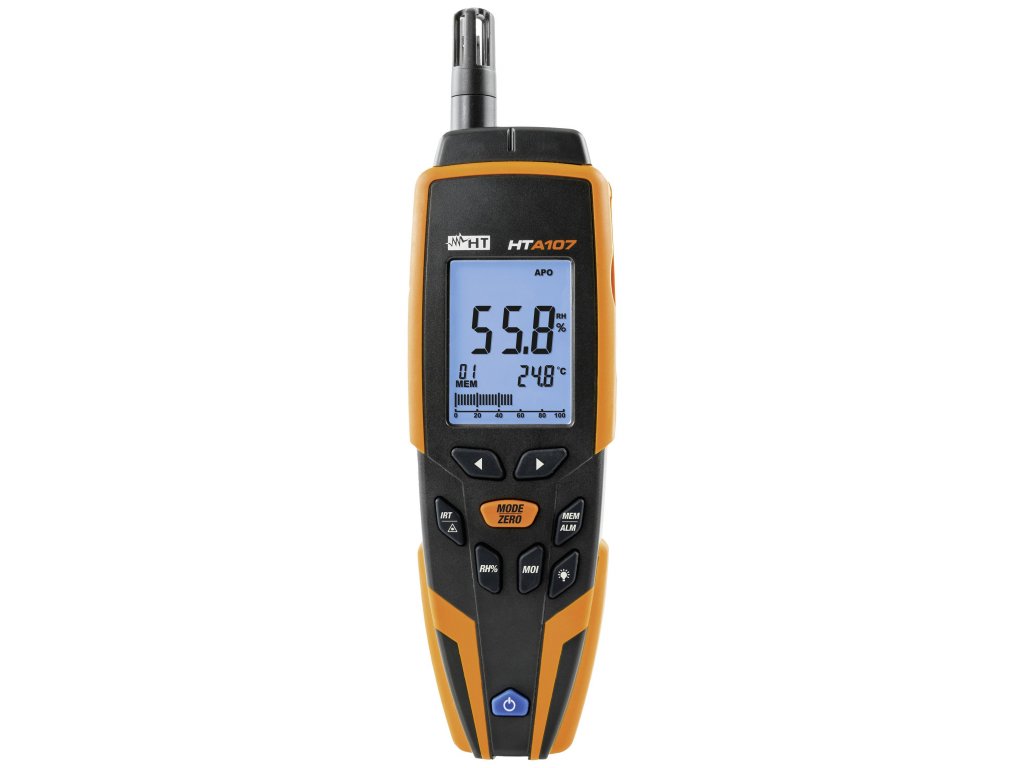 HTA107 umožňuje měření vlhkosti materiálu kontaktní sondou a průrazovou sondou. S tímto přístrojem lze provádět i IR měření teploty a vypočítat teplotní rozdíl pro zjištění kondenzačních situací na površích. Je vybavena podsvícením displeje pro usnadnění čtení ve špatně osvětleném prostředí.Tento text byl přeložen strojově.