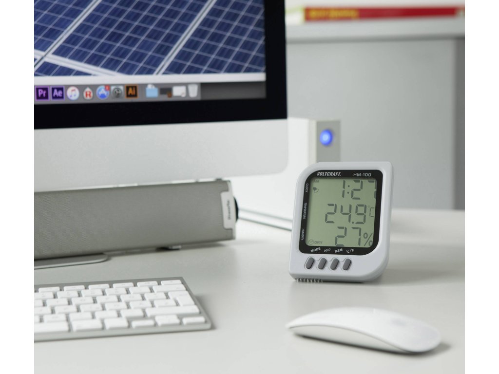 Vlhkoměr HM-100 umožňuje kontrolu okolního vzduchu a hodnoty zobrazuje na displeji. Minimální a maximální hodnoty vlhkosti vzduchu a teploty se ukládají a lze je kdykoliv zobrazit. Zobrazení vyhodnocení klimatu ve formě symbolu a textu COMFORT/WET/DRY. Vlhkoměr lze postavit nebo zavěsit.Specifikace: