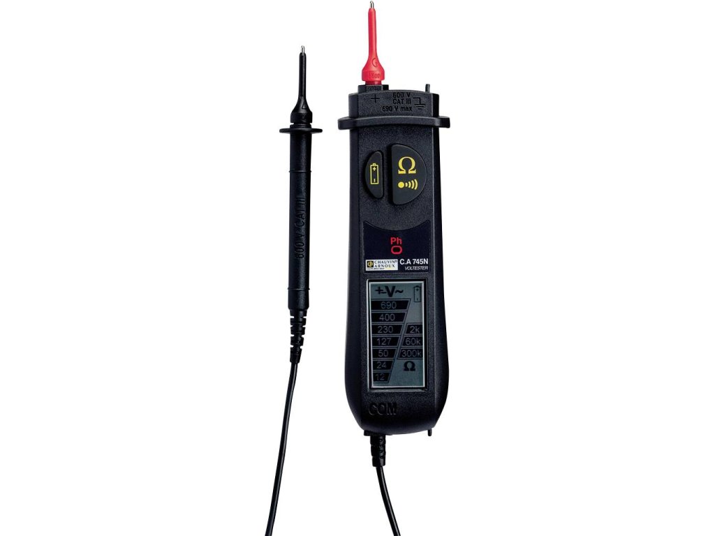 Zkoušečka napětí a průchodnosti C.A 745 N zobrazuje na LCD displej naměřené napětí ve formě sloupcového grafu se 7 úrovní. Kompaktní přístroj dokonale padne do ruky.Jeho hroty jsou odnímatelné a snadná výměna a lze pohodlně na nahrávání na pouzdře einclipsen.