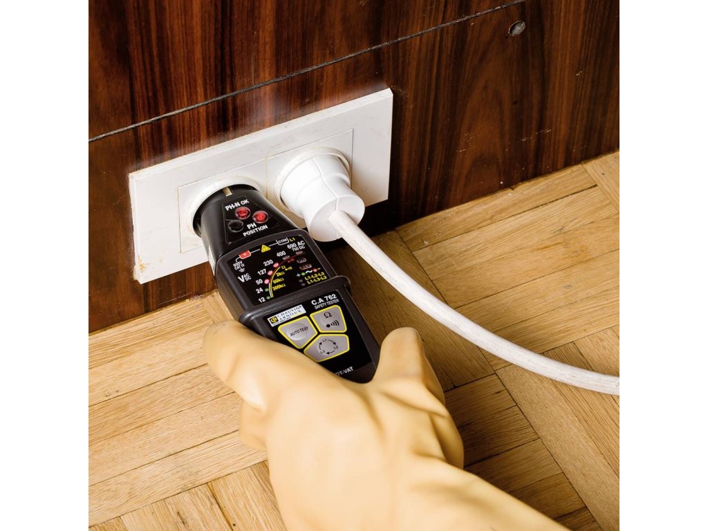 Zkoušečka napětí (VAT) CA 762 je nepostradatelným pomocníkem pro každého elektrikáře, kteří se před zásahem do elektrické sítě obejdou ke kontrole stavu bez napětí. Splňuje normu IEC 61243-3:3 a lze ji proto použít u všech vnějších i vnitřních zařízení kategorie 600 v Cat IV Pro splnění některých norem a předpisů platných v některých zemích jsou k dispozici dvě objednací čísla - s příslušenstvím IP2X i bez něj. CA 762 má s ELV LED, která bliká, jakmile je napětí vyšší než 50 v AC nebo 120 v DC, redundantní bezpečnostní systém.Při rozsáhlém autotestu CA 762 se provedou zkoušky elektrických obvodů, napájení, displejů a bezvadného stavu měřicích kabelů. Zkušební hrot a vedení jsou odnímatelné. S volitelným adaptérem CA 753 lze rychle a jednoduše provádět kontrolu Schuko zásuvek.
