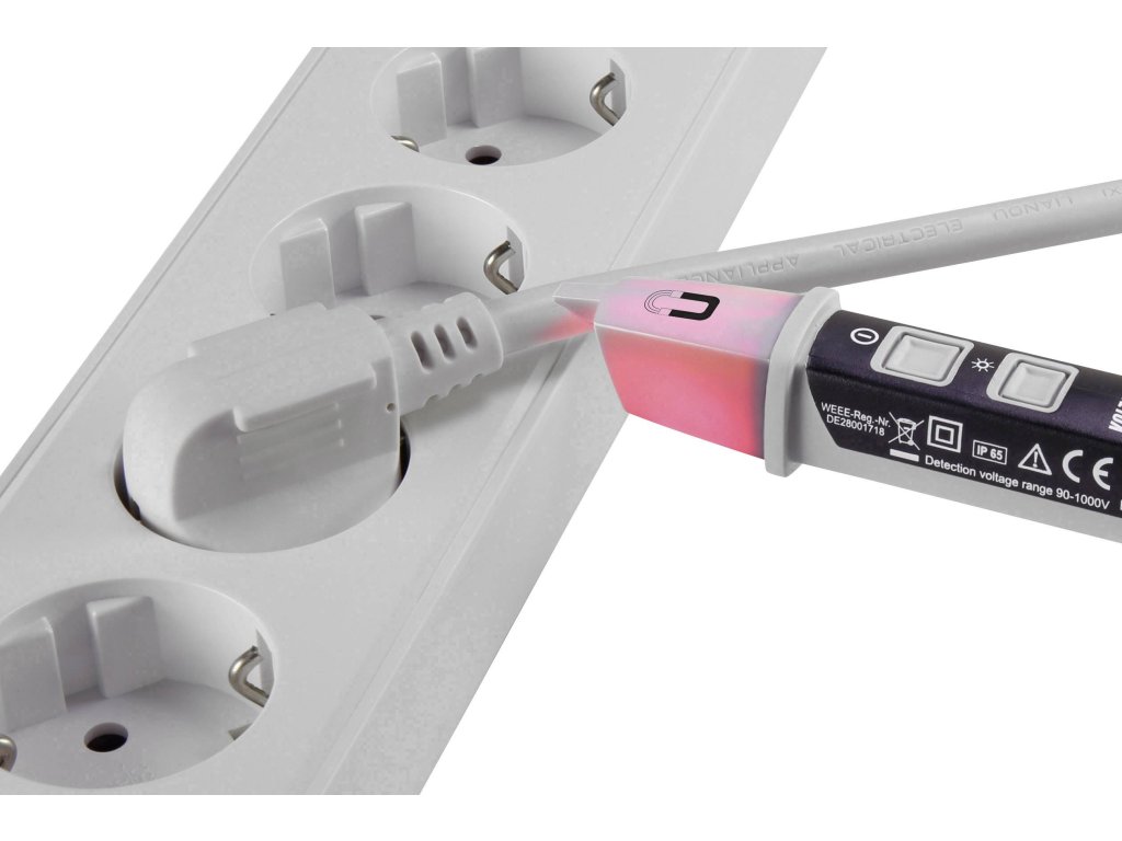 se rozsvítí červená LED dioda na zkušebním hrotu a zazní akustický signál. V případě současné detekce elektrických a magnetických polí se střídavě rozsvěcuje žluté a červené LED světlo.