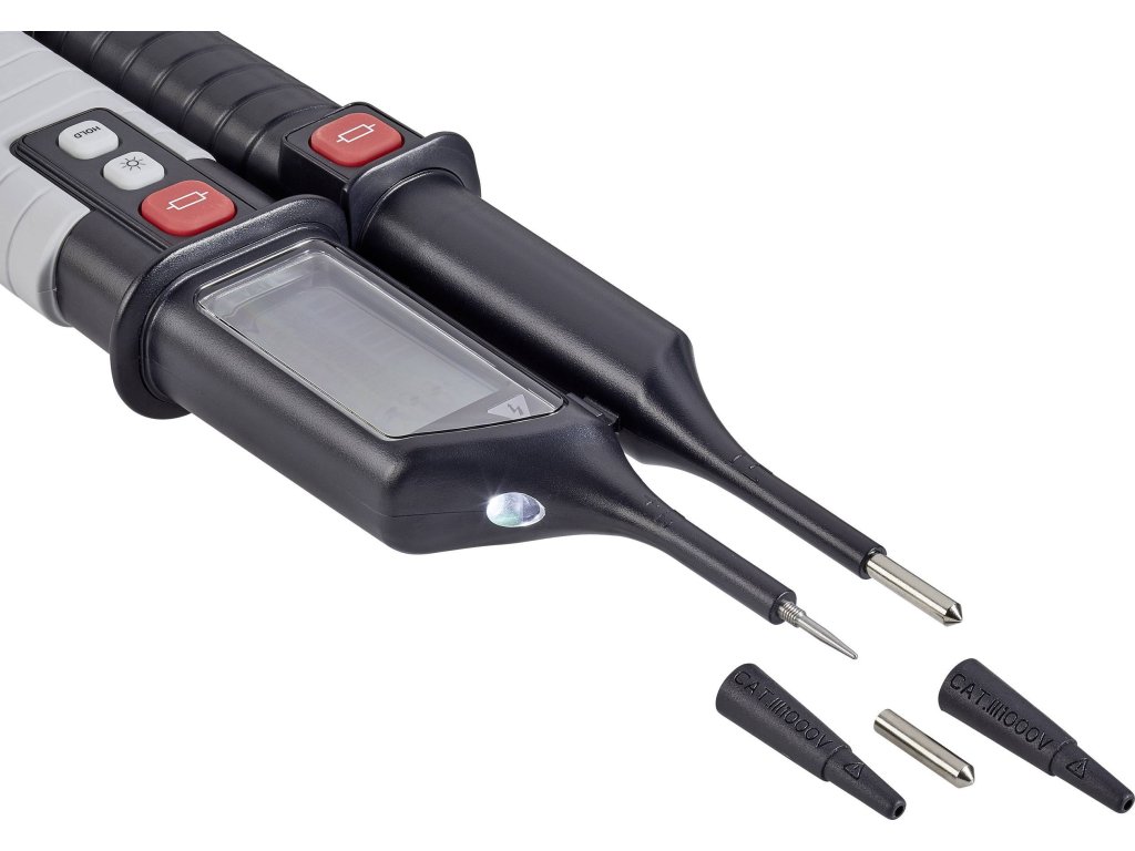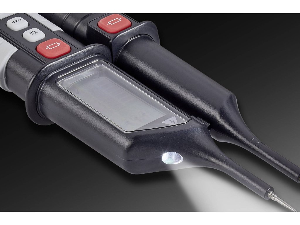 Zobrazení druhu napětí (AC / DC), polarity, nutnosti výměny baterie · Optická a akustická zkouška průchodu · Vestavěná LED svítilna · Ochrana měřicích hrotů · LED / LCD zobrazení napětí · Optická výstraha při nebezpečném napětí (také bez baterií) · Testovací funkce FI (RCD) · Jednopólové indikace napětí · Zobrazení sledu fází · Funkce Data-Hold.